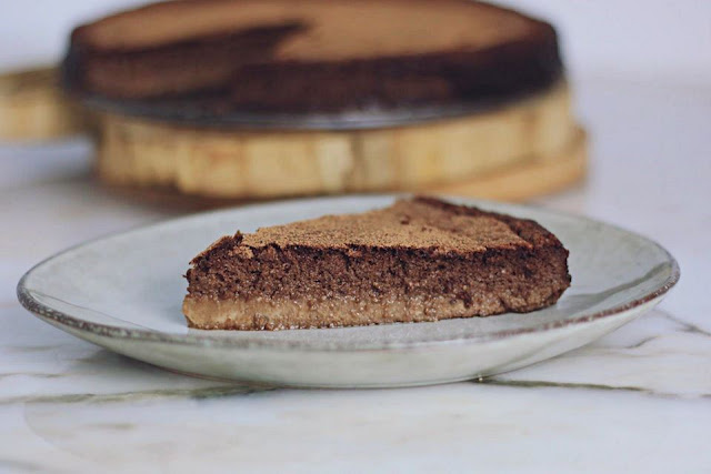 Numa forma com prato removível, unta com óleo de coco e cacau para que seja mais fácil. Verte a massa para essa forma (20cm) e leva ao forno por 50 minutos.